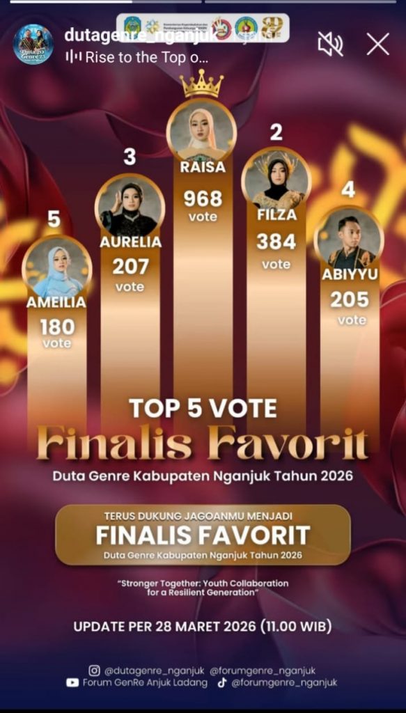 Dengan capaian sementara tersebut, Raisa menjadi salah satu kandidat kuat Juara Favorit Duta Genre Nganjuk 2026. Meski demikian, hasil akhir tetap akan ditentukan dari akumulasi suara hingga penutupan voting.